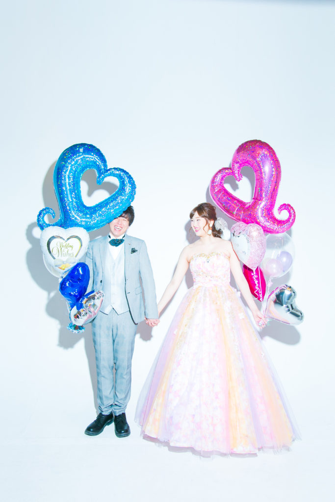 ドレスに映えるカラフルなバルーンを手にしたり、