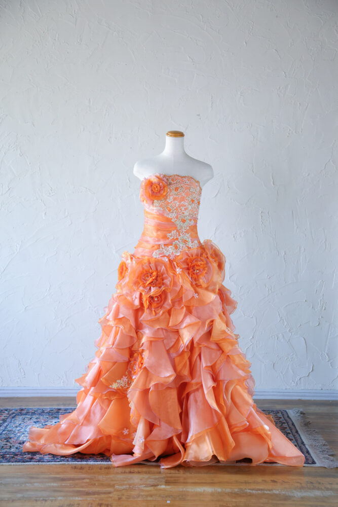 オレンジは、あたたかさ・親しみ・明るい印象を与える色です。オレンジのカラードレスはビタミンカラーで元気な印象があるため、エネルギッシュで親しみやすい雰囲気を表現できます。