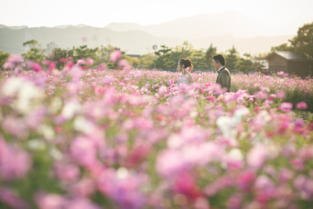花畑の中で並んで歩くシーンや、花を背景にしたショットなど、ロマンチックなカットも残せますよ。