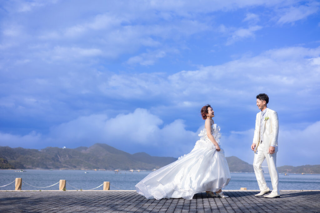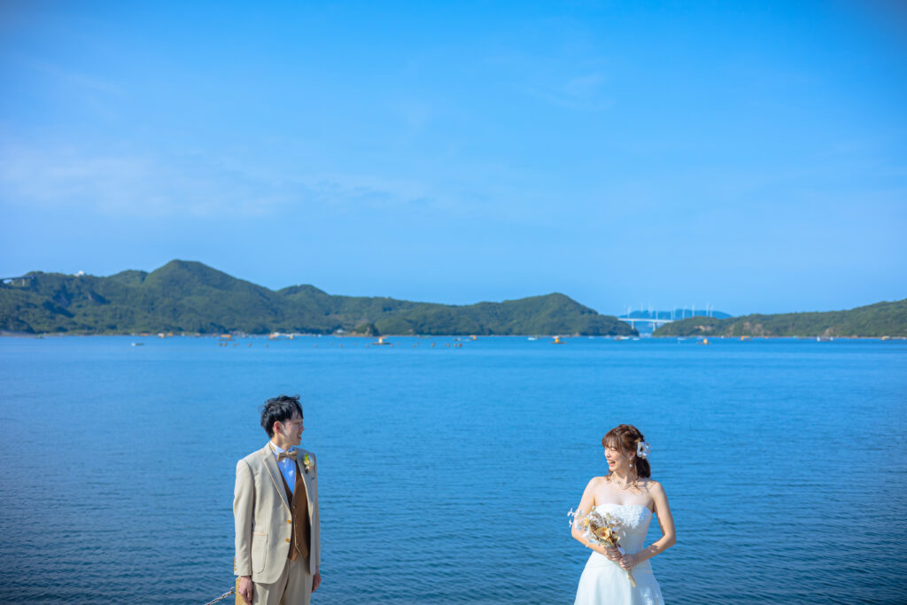 晴れた日には特に、白く輝くドレスがウチノ海の開放的な風景によく映えます。